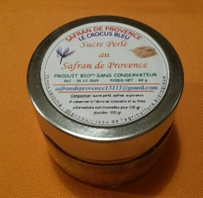 Le sucre perlé au Safran est conditionné en pots de 60 grammes.